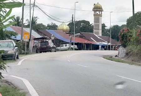 Kanan: Gambar diambil pada tahun 2022, mungkin di lokasi yang sama, berdasarkan selekoh di deretan kedai, serta kedudukan kubah masjid lama (1959) dan menara masjid baru (2022) pada latar gambar. Selain masjid dan jalan baru, deretan kedai seolah tidak banyak berubah. Mungkinkah kedai kopi ini terletak di sini, dan bangunan kedainya masih ada?
